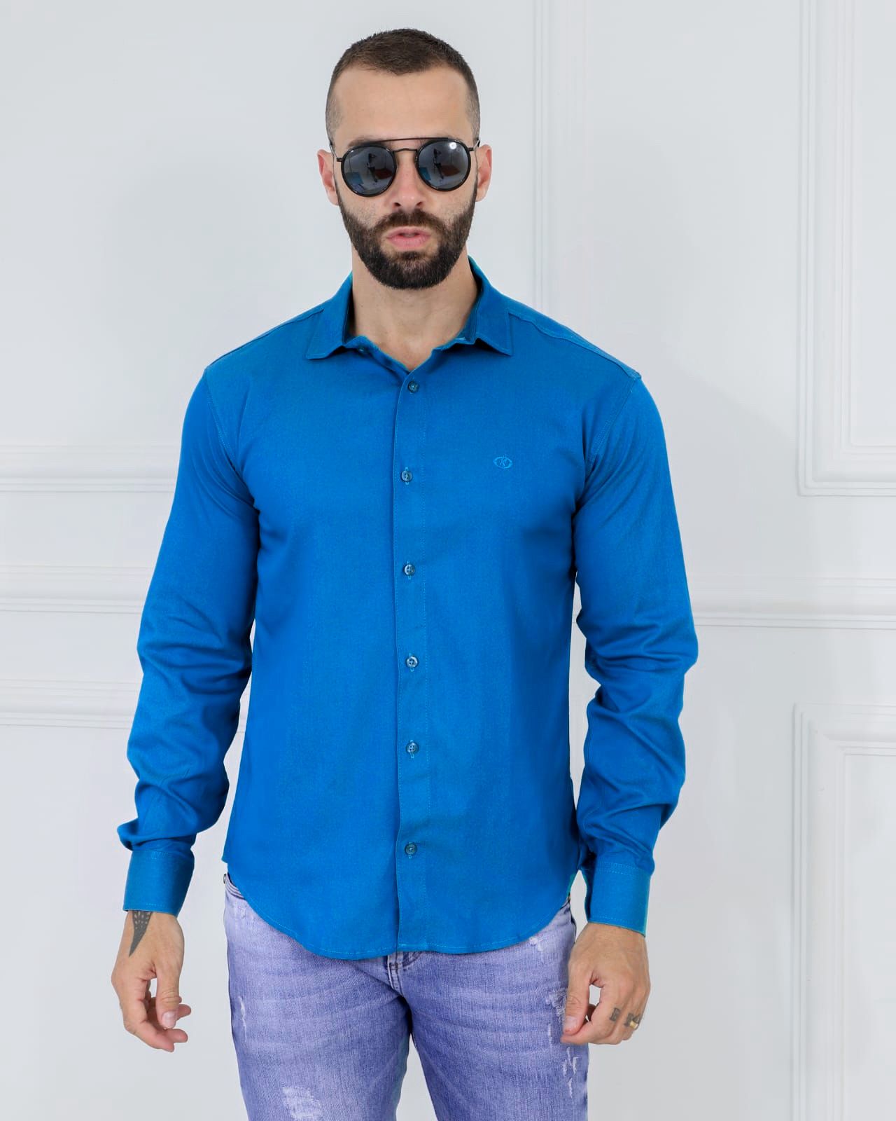 Camisa Manga Longa Slim 100% Algodão Lisa com Elastano